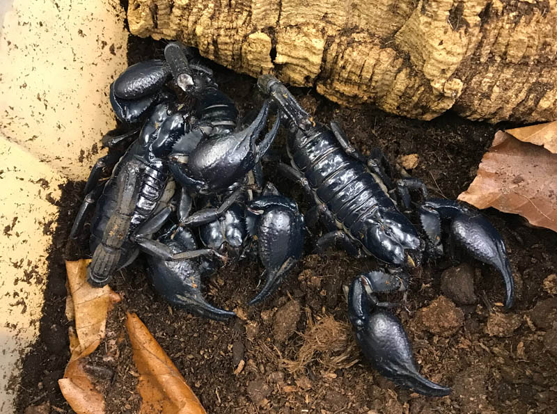 This week’s photo is of my stunning, huge Asian Black Forest scorpion trio. I bought them at the tarantula exhibition in January and paid a premium for them but I wanted them for potential breeding. It is now pretty impossible to obtain Imperial scorpions, they are much easier to breed as they will happily live together. Some of the Asian Heterometrus scorpion species are equally stunning but they prefer a solitary existence and are prone to fighting (and literally killing each other). The second problem with Heterometrus scorpions is that they are generally imported as adults and there are many different species. I cannot tell by looking at them which ones they are and I often doubt that the importer has a clue. I have received batches of them that clearly look a little different but they are all labelled as the same species. These ones didn’t come with a species name but I was assured that they were all the same species and also sexed as two females and one male, an ideal ratio for breeding. I have spent a considerable amount of time on the care of my scorpion friends, initially I set up a large cage with plenty of hides and food. The cage had dry areas, damp areas and warmer, cooler areas too. I first of all placed one of the females in the cage, when she seemed settled I introduced the male and after a week or so I introduced the second female. In the weeks that followed I checked on the scorpions every morning and they were always in their own little hide as far away from each other as they could get and then yesterday I opened the box to add some new food and found them all huddled together under a piece of bark, success! I am really hoping that in time they will mate and produce a new generation of huge and healthy, Asian Black scorpions.