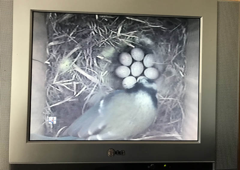This week’s photo: Mummy Blue Tit with her 8 eggs. The nest box with camera is outside my office and I have a lovely clear view on a screen next to my computer (what happened to my other bird box? Well, I know that there are baby Cold Tits in there as I can see mum and dad going in and out with mealworms from my bird table but I can no longer see into the box since my hubby accidentally cut through the cable when he was sorting out ‘old’ wiring recently!)